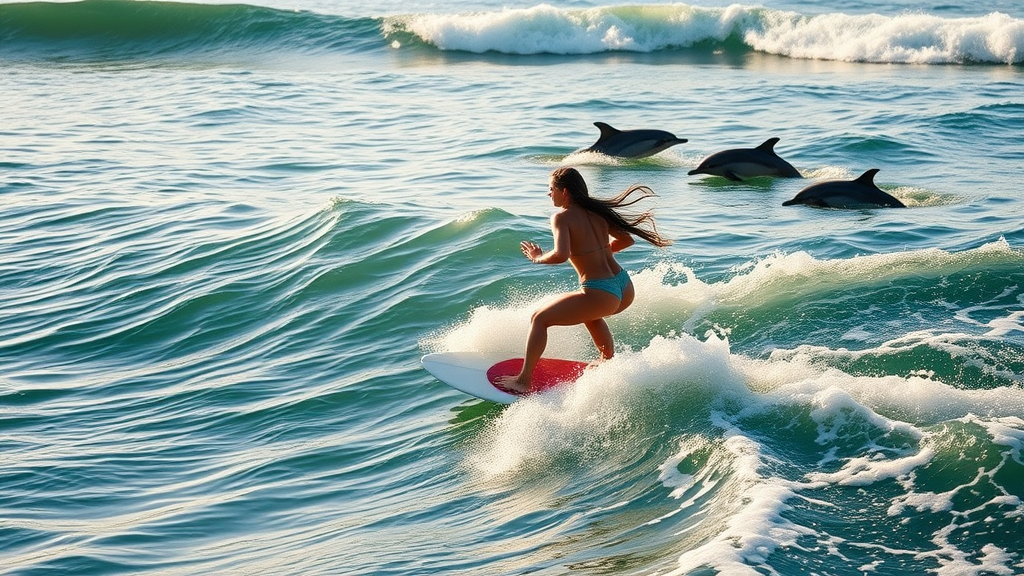 A woman gracefully navigates the waves on her surfboard, feeling the exhilaration as the ocean breeze tangles in her hair, the sun casting a golden glow over the rolling sea, while nearby dolphins playfully leap through the surf.