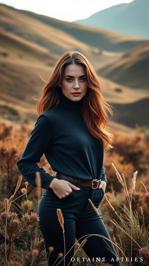 A woman gracefully poses amidst the rolling Scottish hills, embodying the essence of an outdoor fashion shoot. The soft, natural lighting casts a gentle glow, enhancing the earthy tones of the landscape. She is clad in an ensemble of light navy and rich dark brown, blending harmoniously with the surroundings. The scene is captured with a Sony A7III, which skillfully highlights the texture and depth of the rugged terrain. Wisps of heather and wild grasses frame the shot, adding a touch of untamed beauty to the composition. The woman's gaze is serene and confident, reflecting the timeless allure of the highlands.