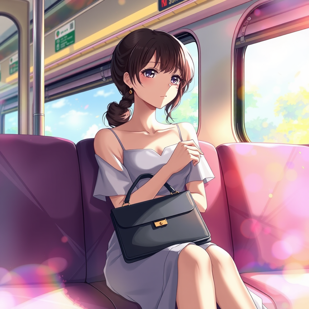 A woman gracefully seated on a train seat, her eyes gazing thoughtfully out the window, with a stylish purse resting on her lap. The scene is an anime-inspired detailed painting, brimming with the aesthetics of elegance and charm. Her expression is serene, capturing the quiet reflection of a moment in transit. The setting around her is subtly infused with vibrant colors, invoking a sense of warmth and life. The train is depicted with meticulous attention to detail, from the soft, cushioned seats to the gentle play of light filtering through the carriage. This artistic portrayal balances beauty with an underlying sense of nostalgia, creating an atmosphere that is both inviting and contemplative.