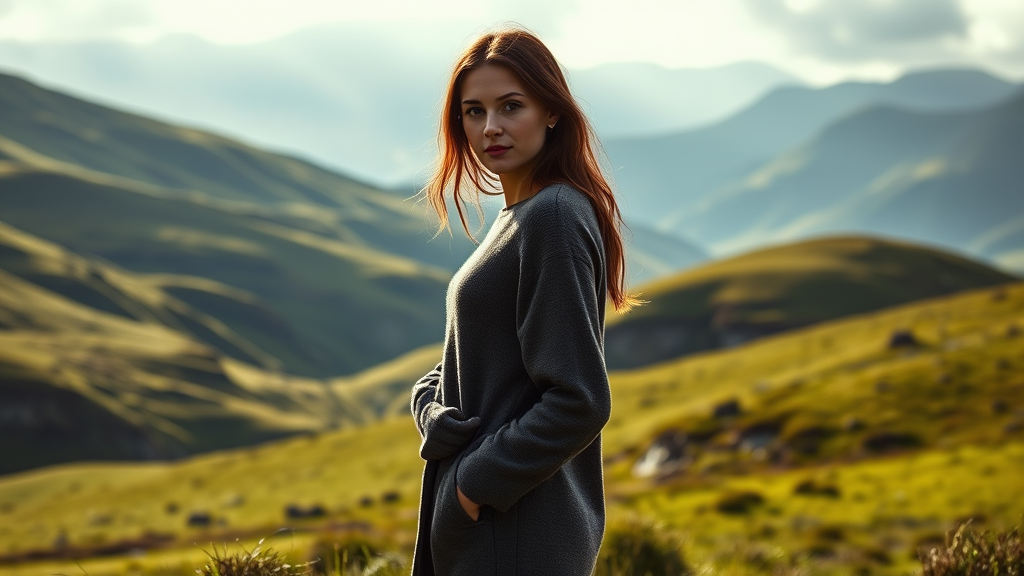 A woman gracefully stands amidst rolling green hills, her silhouette perfectly captured in the gentle embrace of natural lighting. She embodies the essence of an outdoor fashion shoot, her attire a harmonious blend of light navy and dark brown, echoing the rich, earthy hues of the Scottish landscape. The scene is captured through the lens of a Sony A7III, with the camera's precision bringing out the fine details of her textured clothing against the enchanting backdrop of misty mountains and rugged terrain. Her serene expression and poised demeanor exude confidence and tranquility, making her an integral part of the captivating scenery.