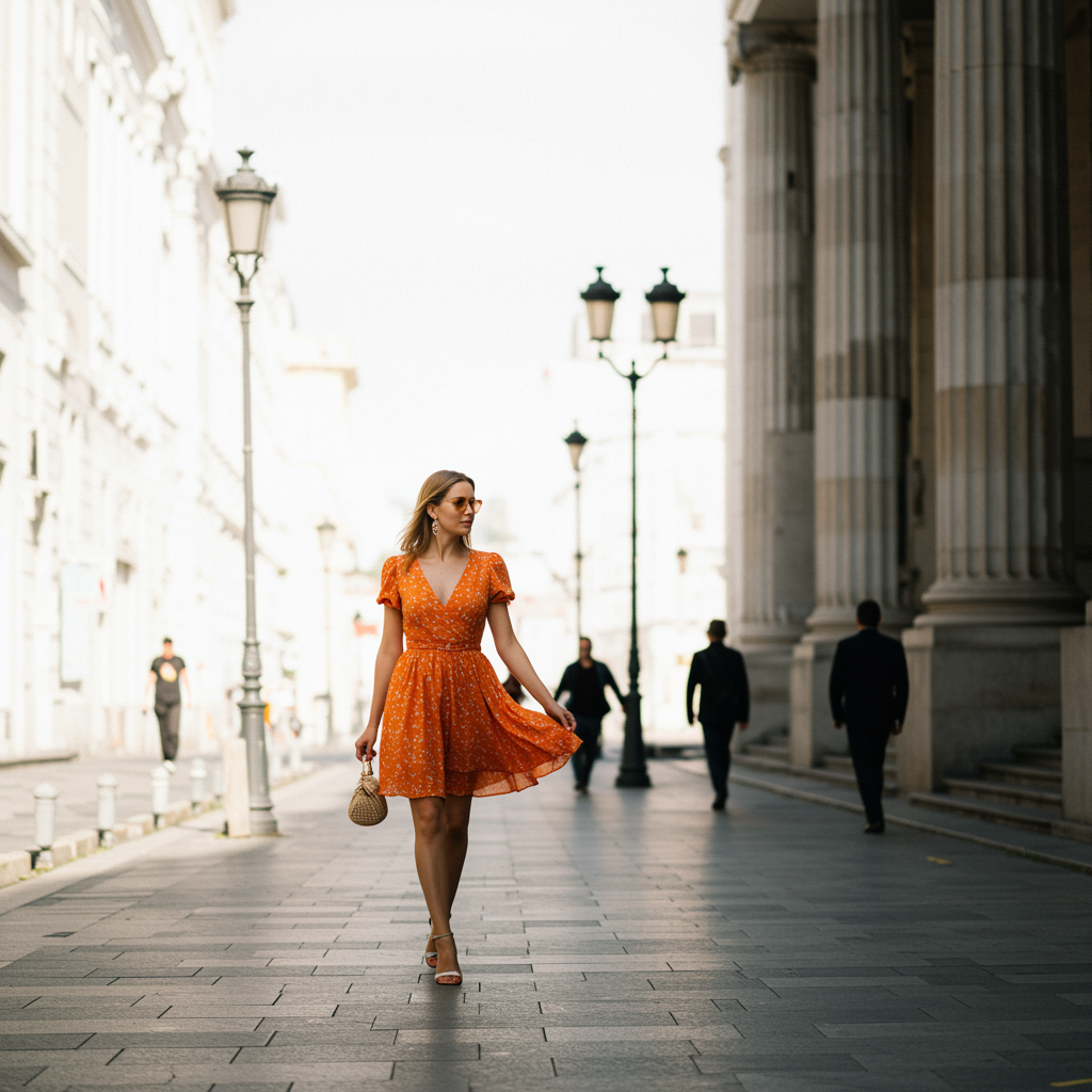 A woman gracefully strolls down a bustling city street, her vibrant orange dress catching the sunlight. The scene is captured in the style of Atey Ghailan, blending classic Hollywood glamour with candid glimpses reminiscent of famous figures' portraits. The background is a crisp white, enhancing the striking aurorapunk aesthetic. The image is rendered in stunning 32k UHD quality, echoing the surreal sophistication of Man Ray with a touch of classical academic influence. The color palette is warm and inviting, evoking the emotive richness of Jonas Burgert's work. The overall effect is elegantly formal yet touchingly intimate, balancing a cute, expressive style with scenic grandeur, creating a timeless, captivating image.