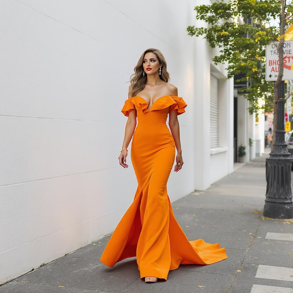 A woman gracefully strolls down an urban avenue in a striking tangerine gown, capturing the essence of ATEY GHAILAN's style alongside classic Hollywood allure. Her candid elegance reflects the aura of iconic figures, set against a minimalist white backdrop that enhances the aurorapunk aesthetic. Rendered in 32k UHD, the scene evokes the surrealism of Man Ray fused with the refined precision of classical academic art. With a warm, inviting color palette reminiscent of Jonas Burgert's work, the woman embodies an elegantly formal yet expressive demeanor. The atmospheric charm is enhanced by scenic elements, blending contemporary sophistication with a hint of timeless glamour.