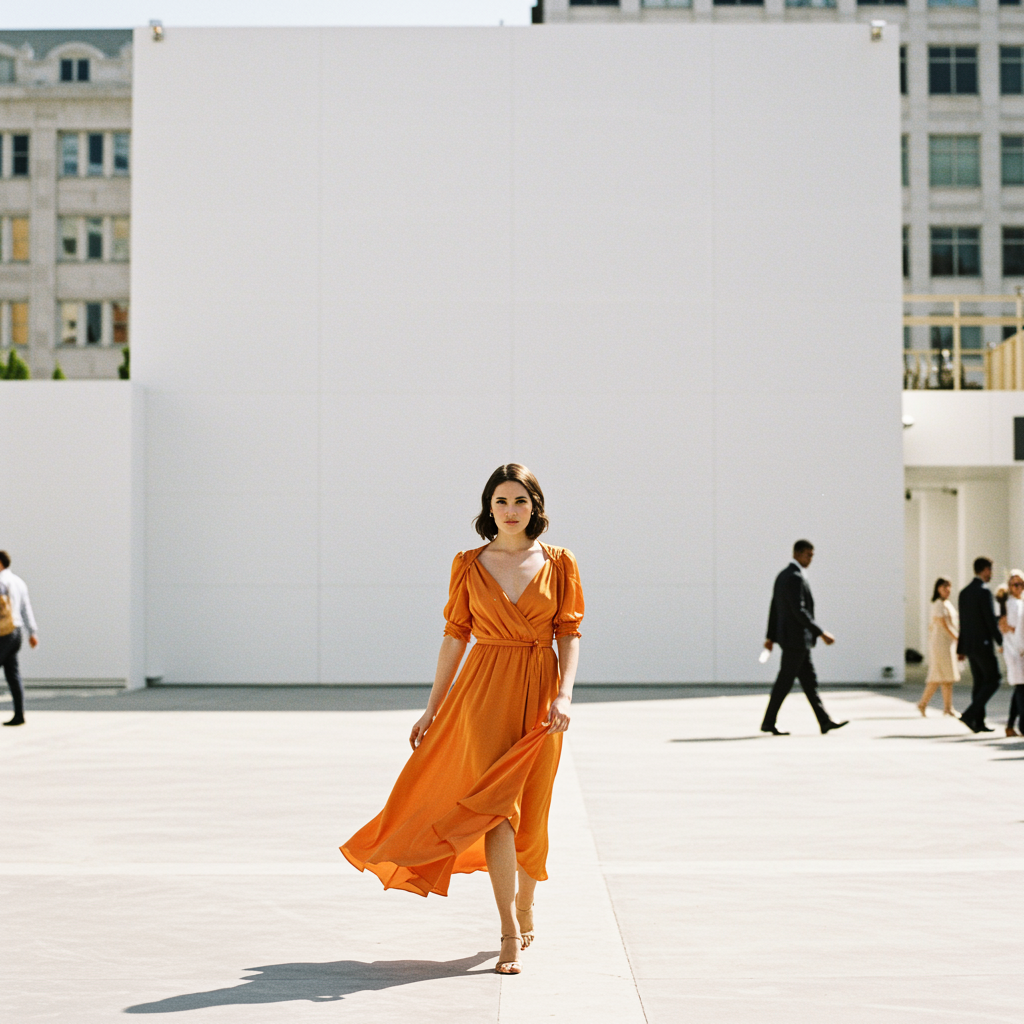 A woman gracefully strolls through a bustling city street wearing an elegant orange gown, her presence captivating like a scene in a classic Hollywood film. The style is reminiscent of Atey Ghailan, blending timeless glamour with the candid essence of legendary figures captured in intimate moments. Set against a minimalist white backdrop, the scene radiates aurorapunk aesthetics with a 32k UHD clarity. The vibe is a fusion of Man Ray's avant-garde photography and classical academic artistry, all enveloped in a warm, inviting color palette inspired by Jonas Burgert. The depiction is both elegantly formal and beautifully expressive, exuding a scenic charm with a cute and expressive twist.