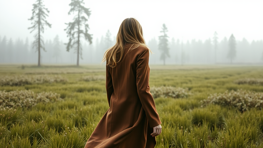 A woman gracefully walks through a verdant field, exuding high fashion in a stylish brown truffle coat, set against a backdrop of a mesmerizing Swedish forest landscape. Her blonde-brown hair cascades elegantly down her back. The scene evokes the cinematic essence of a film still from "Dune" (2020), capturing a sense of mystery and solitude akin to the Tarot card "The Hermit." The composition mirrors the style of Patrick Demarchelier, infused with Britt Marling's ethereal 3/4 profile, as sleek, flowing shapes embrace the idyllic taupe scenery. The ambiance is reminiscent of Cicely Hey's evocative imagery, blending nature's tranquility with avant-garde elements.