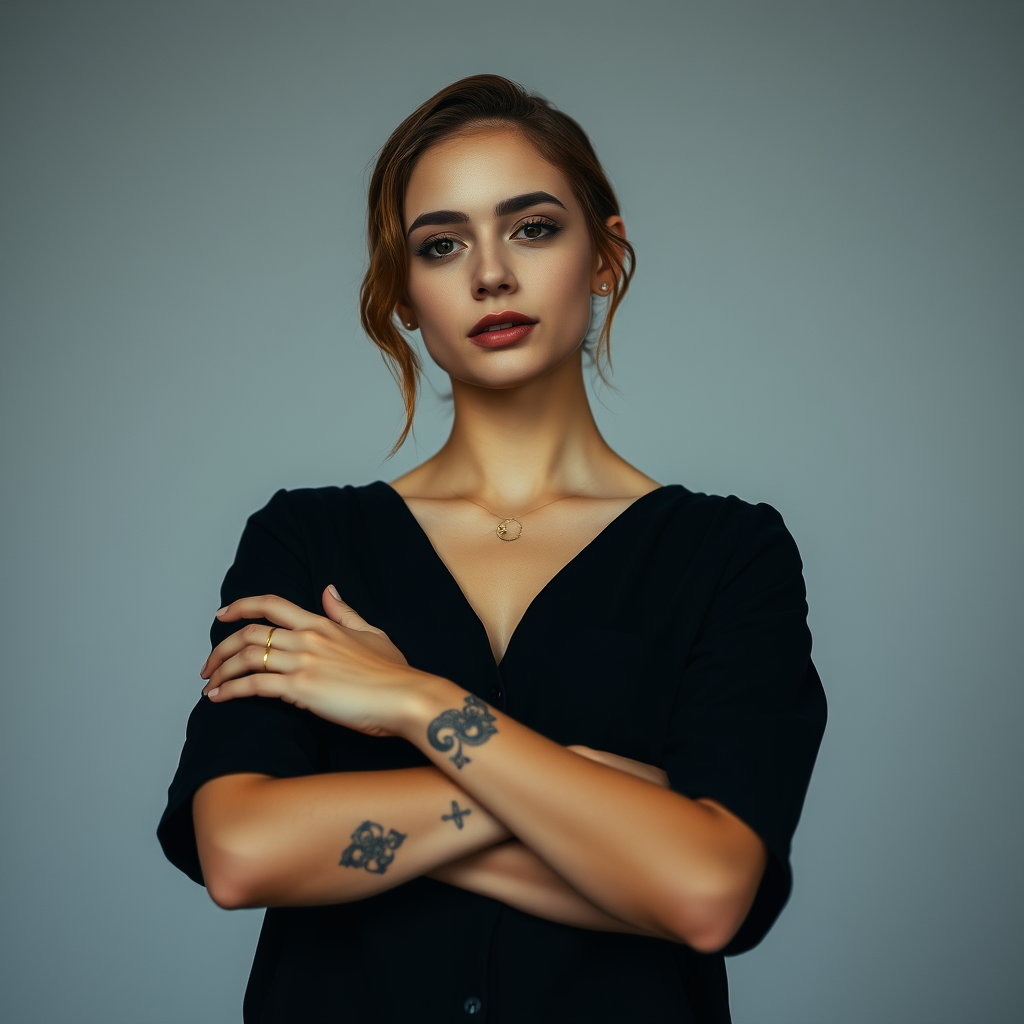 A woman in a black shirt stands confidently with her arms folded, exuding an effortlessly chic normcore vibe. Her look is infused with the intricate style of tattoo artistry, blending dark silver and dark gold tones that highlight the curves and connections at her joints. She emanates a palewave aura, the subtlety of her appearance complemented by a happycore energy that brings an unexpected lightness to the scene. The overall impression is one of understated elegance and modern sophistication, seamlessly merging different artistic elements into a cohesive vision.