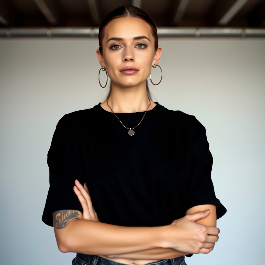 A woman in a black shirt stands confidently with her arms folded, embodying the essence of tattoo artistry and normcore fashion. Her style is highlighted by dark silver and dark gold accents, capturing a happycore vibe. The image focuses on her joints and connections, effortlessly showcasing her chic nature. With a palewave aesthetic, the setting evokes a serene yet edgy atmosphere. The aspect ratio is 9:16, and the style is elegantly enhanced for a captivating visual narrative.