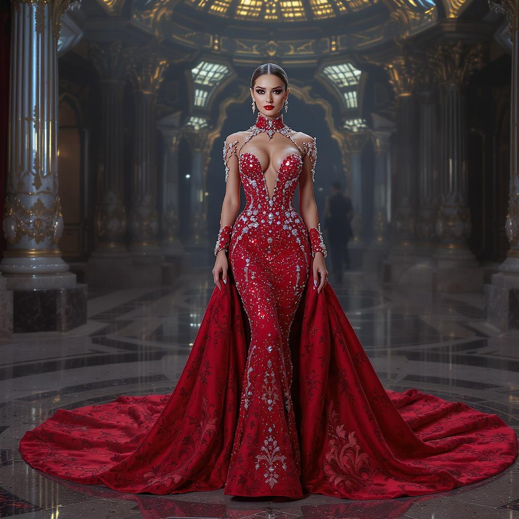 A woman in a breathtaking red gown crafted from rubies and sparkling diamonds, embellished with intricate details, embodies the epitome of fashion elegance. The dress, made from the softest silk, showcases its detailed texture and brocade pattern, making a striking visual statement. Set against the backdrop of a Sci-fi Victorian room within a grand hall, the gown’s turtleneck design adds a sophisticated touch. Ideal for wedding photography, this bridal masterpiece offers a full-body, symmetrical view, brought to life in an ultra-realistic, cinematic lighting environment. Inspired by the artistry of Peter Mohrbacher, the scene is rendered with octane precision, capturing every facet in stunning 8k and 4k resolution. Her flawless beauty shines, evoking a magical and glamorous atmosphere.