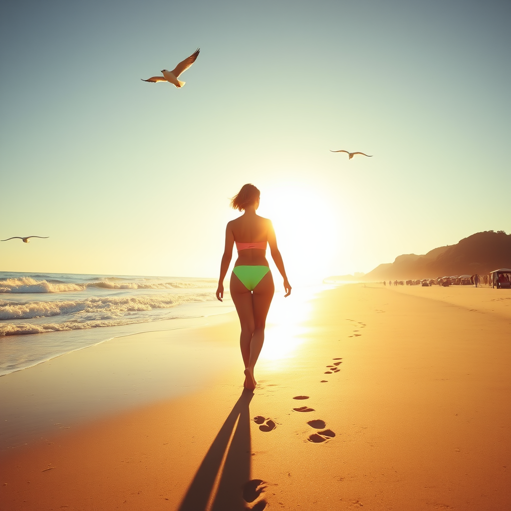 A woman in a bright swimsuit strolls along the sunlit beach, her silhouette framed by the gentle waves and the golden glow of the afternoon sun, seagulls soaring overhead and footprints trailing softly in the sand.