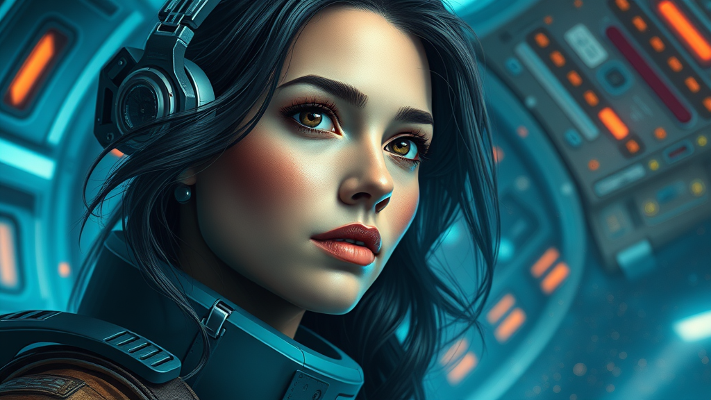 A woman in a character portrait set in a captivating space environment, featuring high-detailed official artwork with fantastic hyperrealistic elements. The scene is enhanced by dynamic lighting, capturing every detail in vivid clarity. The artwork maintains a focus on realism and expression, showcasing an imaginative portrayal. The image should avoid any common digital art imperfections such as blurry visuals, text errors, or anatomical inaccuracies, ensuring a flawless and engaging representation.