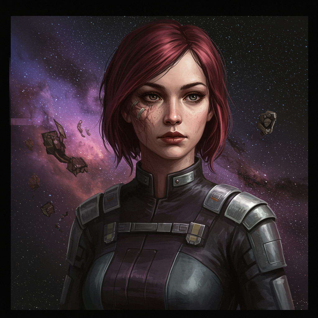 A woman in a character portrait set within a space art scene, captured in high detailed official artwork style. The piece showcases fantastic screenshot art with hyperrealism and dynamic lighting. Despite its lowres elements, the artwork maintains an intriguing balance with text incorporated seamlessly. While some imperfections such as missing or extra digits, cropping, and occasional jpeg artifacts appear, they add to the unique charm of the art. Subtle flaws like bad anatomy, poorly drawn hands or feet, and elements slightly out of frame contribute to the overall narrative. The piece includes blurred and fuzzy details, alongside intentional misshaping and distorted features that offer a grotesque, yet fascinating aesthetic. Watermarks and occasional artist signatures peeking through add authenticity to this unconventional visual experience.