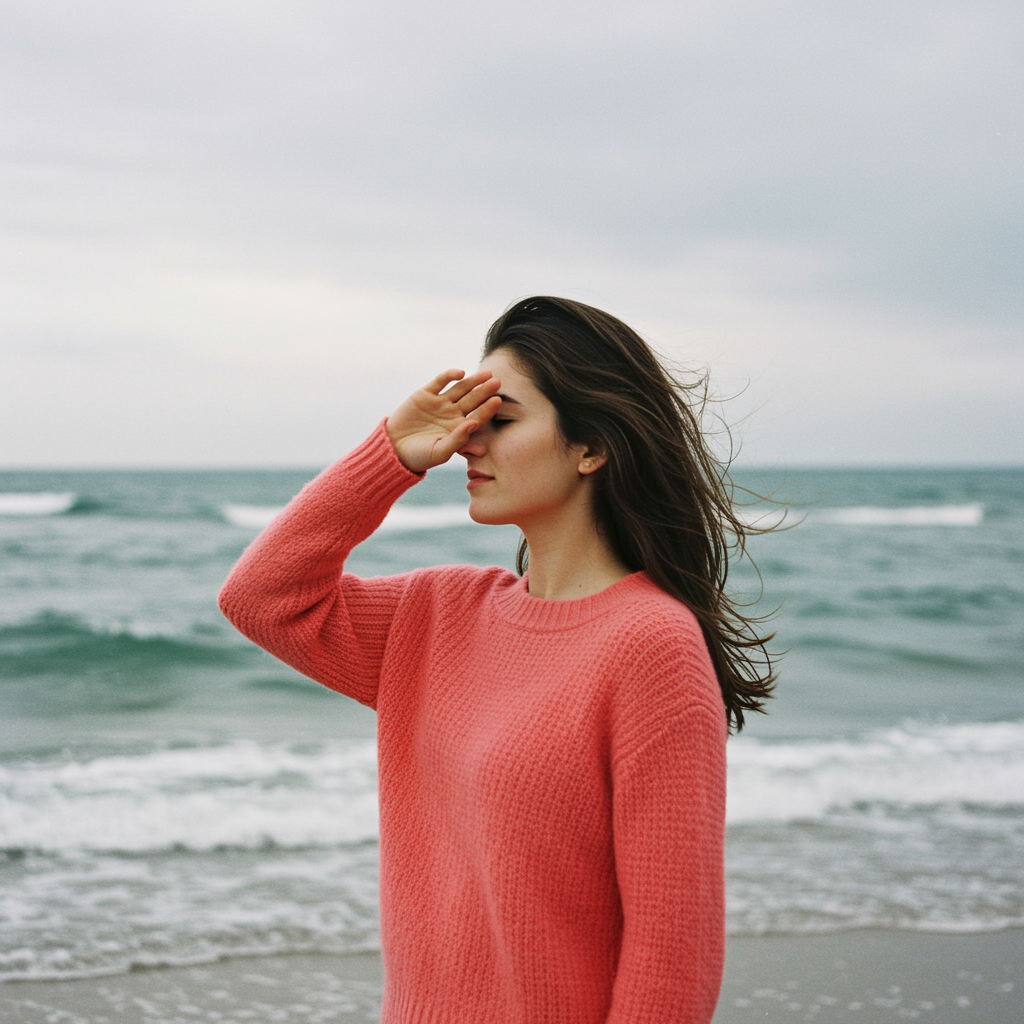 A woman in a coral pink sweater shields her eyes with one hand as she stands on a windswept beach. The ocean waves crash dramatically against the shore while her hair dances wildly in the breeze. The photograph captures this moment from afar, imparting a nostalgic film grain effect reminiscent of a 35mm lens with the subtle hues of Kodak Portra 400T. The distant ocean horizon stretches across the frame, and the vibrant pink of her sweater creates a gentle motion blur, adding an ethereal quality to the scene.