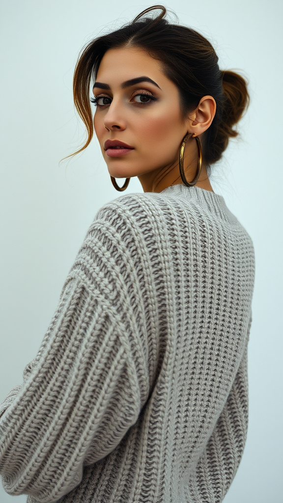 A woman in a cozy sweater with large brown hoop earrings, inspired by Shirin Neshat's style, exhibiting graceful curves and an ethereal palette of light silver and gray. Captured in candid celebrity-style moments, reminiscent of Penelope Rosemont's work, her strong facial expression conveys depth. The scene evokes a folk/naïve aesthetic, blending elegance and authenticity.