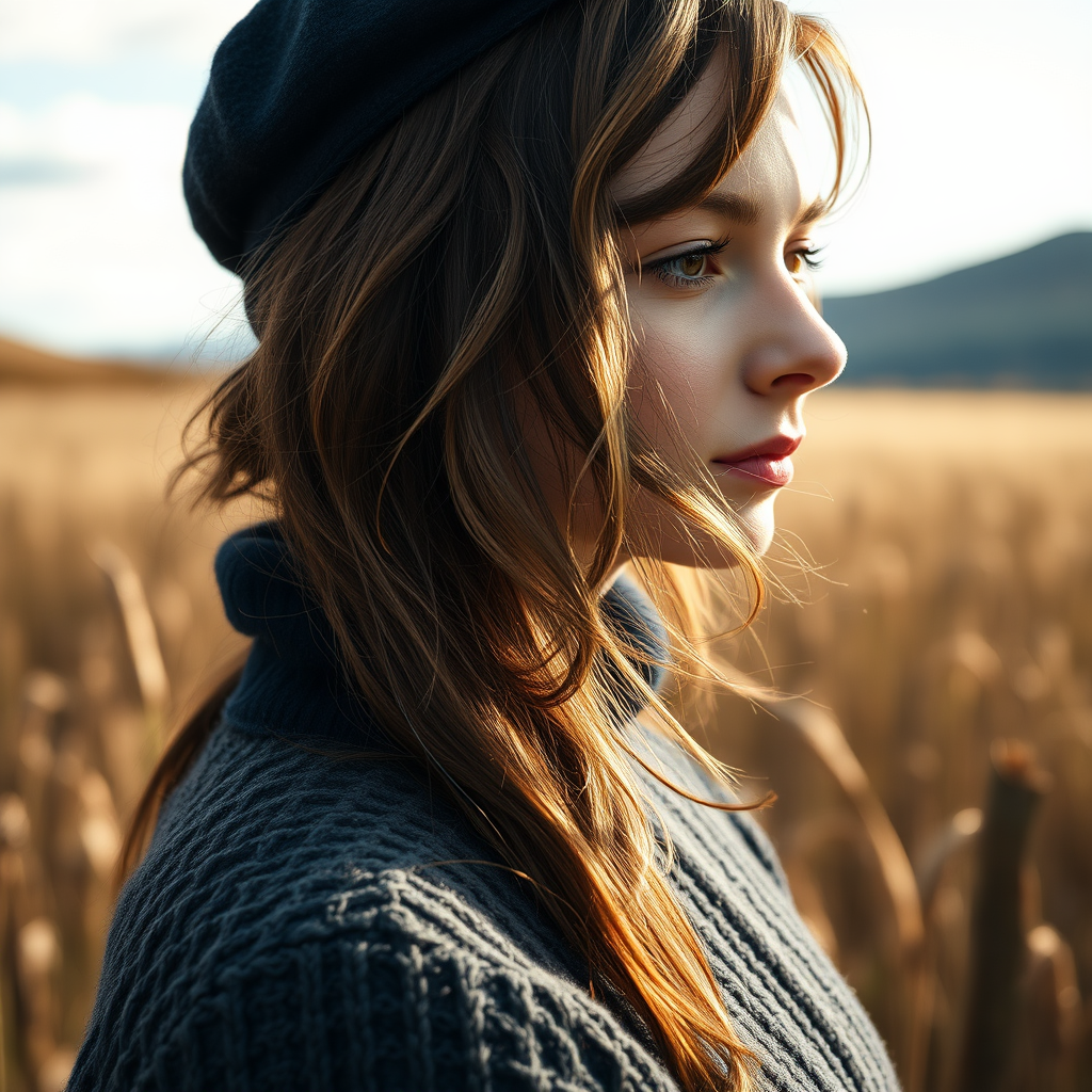 A woman in a field, captured in the style of an outdoor fashion shoot amidst the stunning backdrop of Scottish landscapes, bathed in natural lighting. The scene highlights the rich tones of light navy and dark brown, complemented by elegant touches reminiscent of Georg Jensen. The focus is on intense close-ups, revealing intricate details and textures, all beautifully shot on a Sony A7III, with an aspect ratio of 34:65, offering a fresh perspective that enhances the original vision.