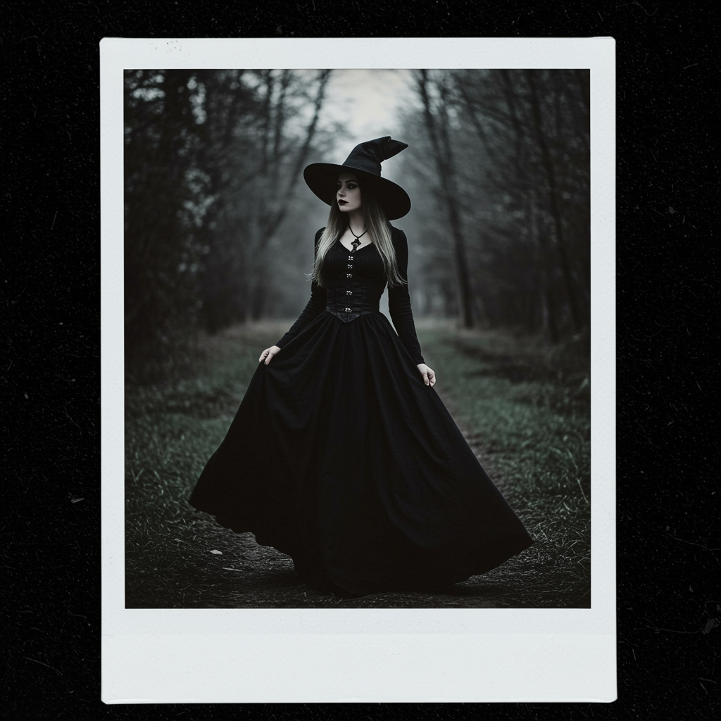 A woman in a flowing, elegant black gown stands gazing into the distance, her presence exuding an aura of mystique. She wears a stylish, oversized witch hat that adds an enchanting flair to her silhouette. Her surroundings possess a dark, atmospheric quality reminiscent of black metal aesthetics. Captured in the vintage charm of a Polaroid photo, the scene embodies a haunting blend of elegance and intrigue with a subtle artistic twist, portrayed through a 105mm lens in a 9:16 aspect ratio.
