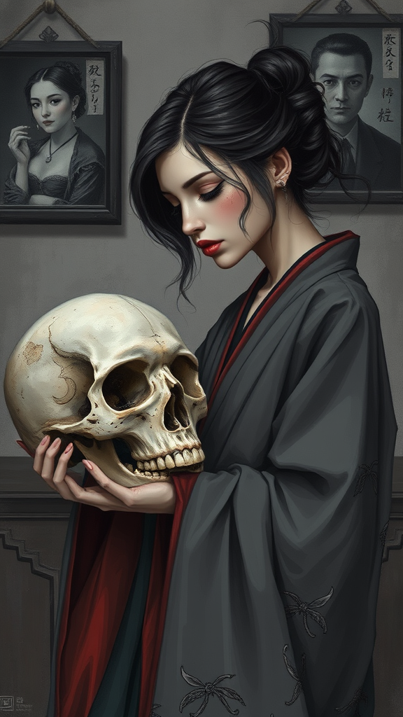 A woman in a flowing, Japanese-inspired robe, her hair elegantly styled in a chic anime fashion, leans tenderly towards a weathered skull, her lips almost brushing its surface. The scene captures a gothic ambiance with subtle touches of realism, the detailed textures of the skull contrasting against her unblemished skin. Dominant hues of gray create a somber atmosphere, punctuated by deep crimson accents in the robe and her piercing eyes. The black and white portraits hanging in the background add a narrative depth, each hinting at stories of the past. Andreas Rocha's influence is evident in the intricate brushwork and atmospheric depth, while the overall composition retains a sense of melancholy beauty.