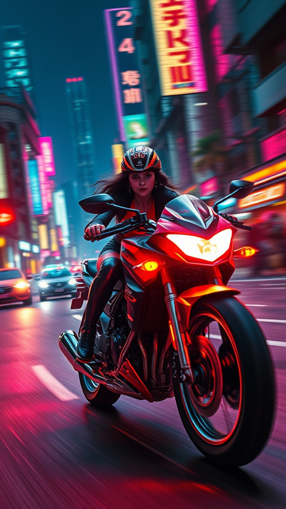 A woman in a high-speed motorcycle chase through a neon-lit cyberpunk cityscape, her bike aglow with vibrant colorful lights, dressed in tight red and black gear. The scene is a whirlwind of motion blur and virtual effects as she speeds down the bustling streets at night. The atmosphere is dark and tense, enveloped in suspense, captured in a photorealistic style with dramatic lighting and cinematic flair, enhanced by film grain to emphasize the gritty action. Rendered in 4K resolution, this masterpiece painting or illustration showcases high-resolution details, with a focus on the thrilling dynamics of the chase. Although maintaining the core concept, the scene avoids unreal elements like extra limbs or fingers, an unrealistic road, or monochromatic and dull colors that might detract from the exhilarating, vibrant narrative.