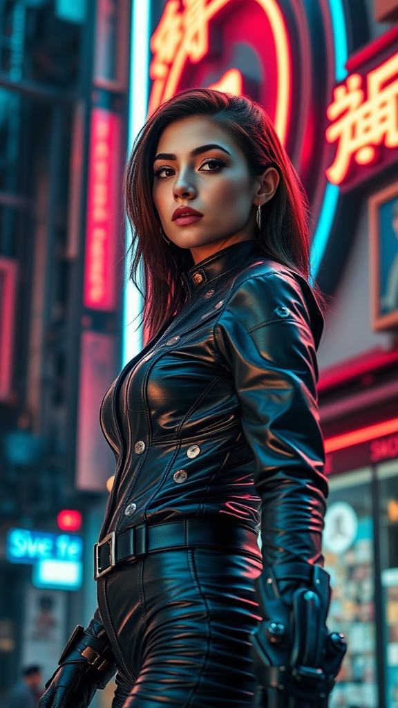 A woman in a hyper-realistic sci-fi world stands confidently in front of a vivid neon sign, her steampunk aesthetic blending seamlessly with futuristic elements. She wears intricately designed leather attire that glimmers in the neon glow, reminiscent of iconic DC Comics characters. Captured in the style of candid shots with the clarity and depth offered by a Sony Alpha A1, she exudes an enigmatic presence. Her hair, styled in a futuristic mote kei fashion, cascades down her back, complementing her bold and dynamic pose. The setting is a bustling city backdrop, where steel structures and advanced technology merge, creating a visually striking interplay of light and shadow.