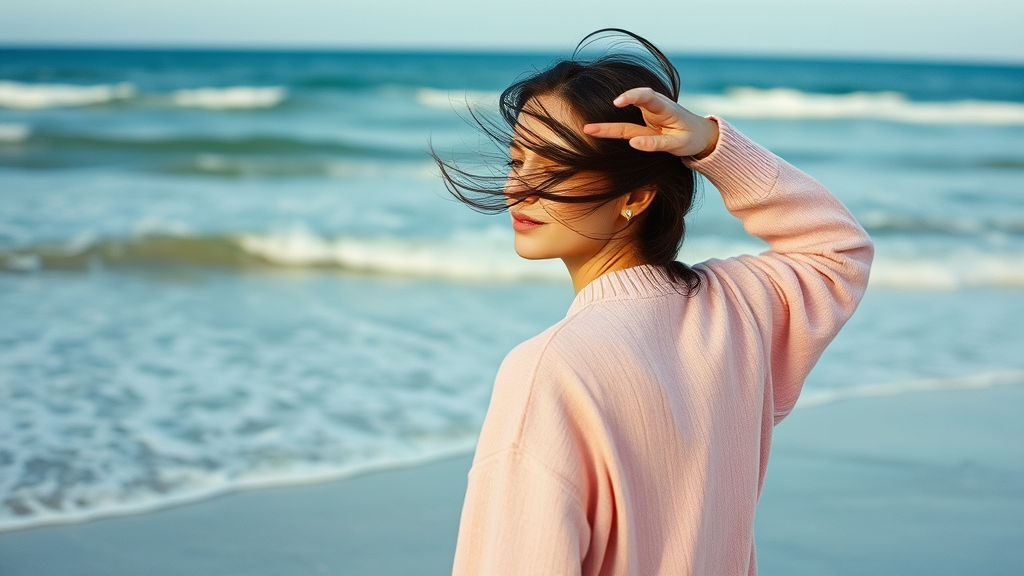 A woman in a pastel pink sweater stands on the beach, shielding her eyes with one hand, as the ocean's waves crash rhythmically against the shore. The brisk wind causes her dark hair to dance wildly, the strands caught in the breeze. Captured from afar, the scene evokes a nostalgic film grain effect, reminiscent of a 35mm film camera, specifically in the Kodak Portra style. The distant ocean horizon is visible, adding depth to the image, and a subtle motion blur traces the movement of her pink sweater as it flutters in the wind.