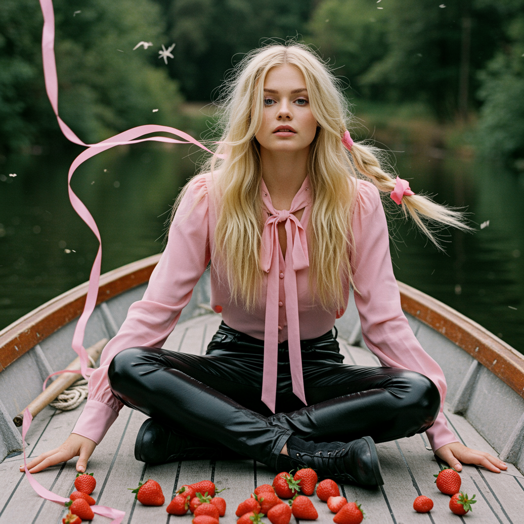 A woman in a pink blouse sits confidently on a boat, her flowing blonde hair catching the sunlight. She wears glossy black leather jeans that contrast with the soft hues of the surrounding scene. Inspired by the whimsical style of Emma Andijewska and the ethereal beauty of Samara Weaving, her look embodies a blend of fantasy and fashion-forward elegance. The atmosphere is enriched with subtle symbols: a ribbon intertwined with her hair, a hint of whimsical energy swirling around her, strawberries scattered at her feet, and a faint aura that suggests a fairy-like presence. The setting feels like a Harper's Bazaar photoshoot, capturing a moment that's both magical and avant-garde.