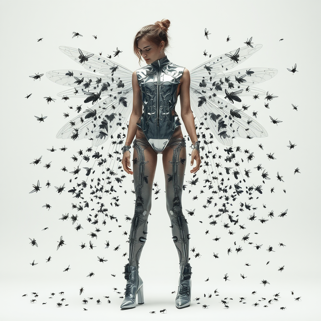 A woman in a reflective chrome vest paired with an intricate costume and futuristic shoes, embodying the essence of cybernetic surrealism and womancore. Her form is crafted from swarming insects, creating an intricate tapestry of life that ebbs and flows across her body. The color palette features shades of dark white and light black, seamlessly blending into an ethereal, flowerpunk aesthetic. The scene captures realistic renderings of the human form, intricately weaving organic and synthetic elements in a dynamic and raw style.