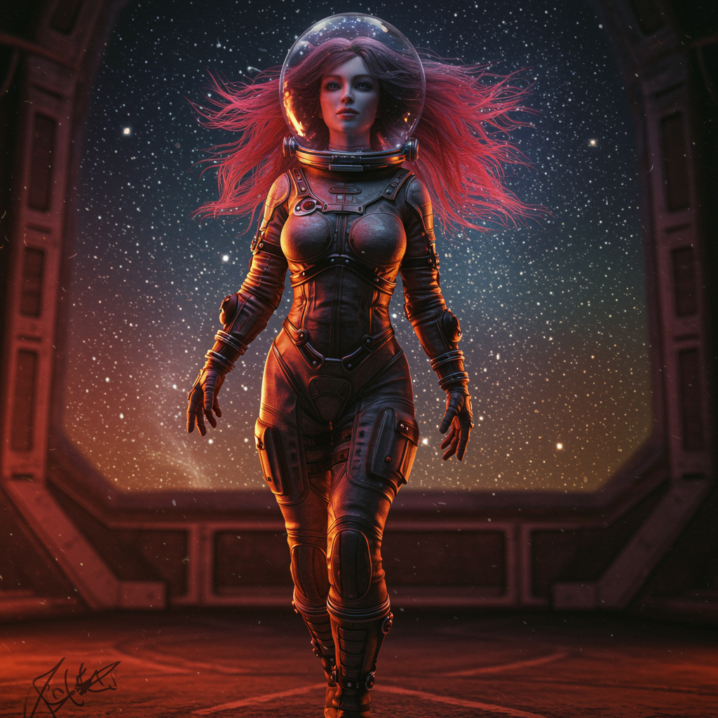 A woman in a retro-futuristic space suit stands poised, embodying the essence of space art with her high-detail, hyperrealistic portrait. Her hair flows with the stars, resembling the serene expanse of the Milky Way. Surrounded by dynamic lighting that captures the intricacies of her exquisitely detailed armor, the setting evokes fantastic, dreamlike imagery. Despite being a low-resolution capture with jpeg artifacts, you can sense her presence beyond the imperfections. Her anatomy might seem unconventional, with suggestively extra or missing digits adding an alien allure to her form, while her hands and feet, though imperfectly rendered, contribute to the enigmatic aesthetic. The scene, slightly out of frame and with blurred edges, carries the charm of vintage sci-fi ambiance marked by texture anomalies and traces of signatures hinting at otherworldly art.