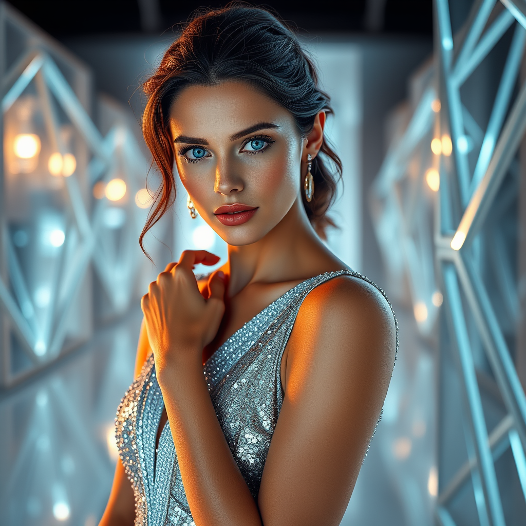 A woman in a shimmering silver gown elegantly poses for a photograph, her bright cerulean eyes captivating the viewer's gaze, reminiscent of a high-end Dior fashion campaign. The backdrop hints at futuristic themes with elements inspired by tesseract shapes. Echoes of Miranda Kerr's grace influence her poise, as the setting harmonizes with the artistic trends found on CG Society, blending modernity and timeless beauty. The scene is set in a captivating 3:4 aspect ratio, highlighting every intricate detail.