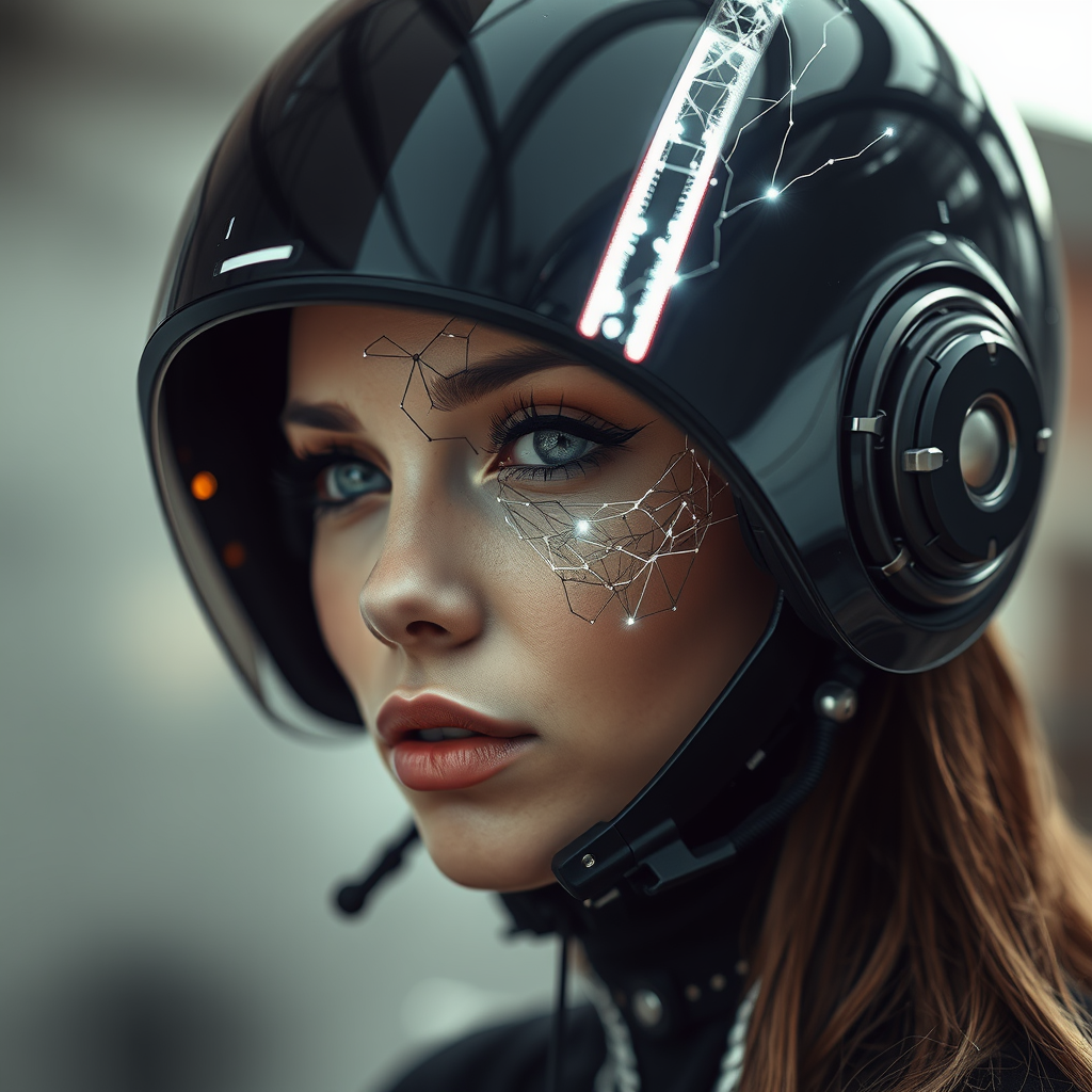 A woman in a sleek cyberpunk helmet featuring a lustrous obsidian finish and intricate robotic details. Her face is subtly illuminated by the gleam of radiant silver filaments, intricately woven into a mesmerizing web of luminescent patterns. She strikes an editorial pose with hyper-realistic precision, capturing the essence of a futuristic theme. The scene is rendered in stunning 8K resolution, delivering crisp, high-definition quality, with an artistic flair that emphasizes the stylized, high-tech ambiance of the setting.