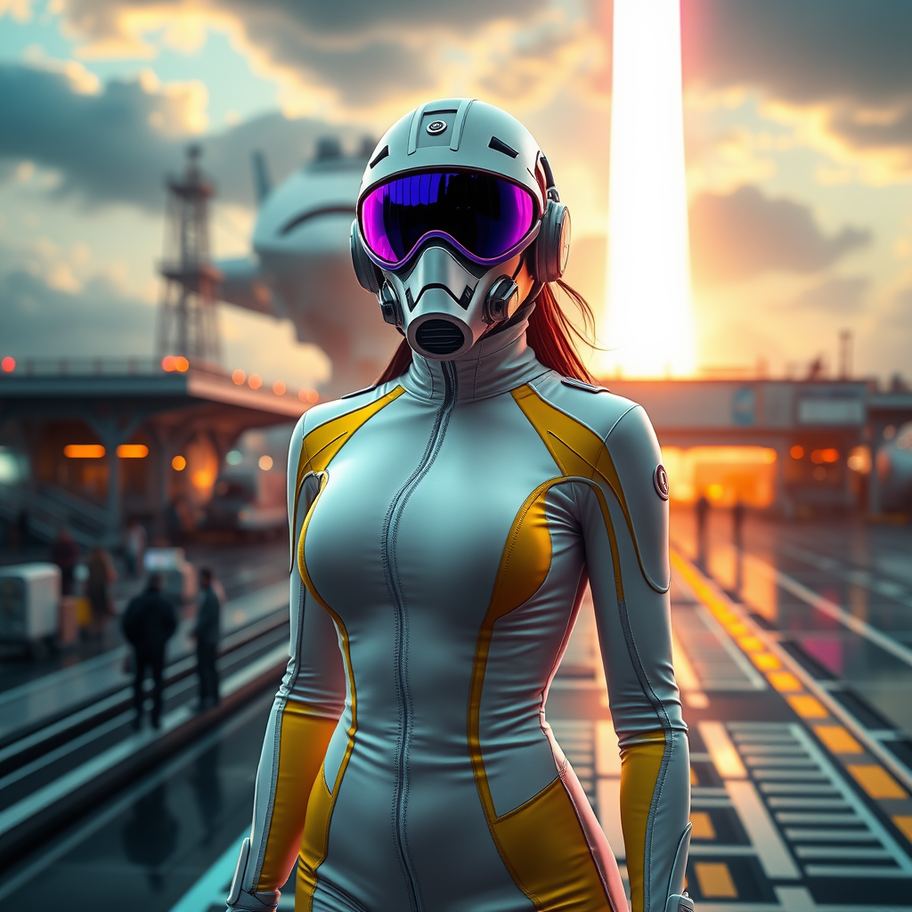 A woman in a sleek, form-fitting white and yellow jumpsuit stands confidently at a bustling spaceport, as a majestic ship launches in the background. She wears a futuristic mask paired with a striking purple sci-fi visor, complete with advanced lenses and a high-tech respirator. The scene is vibrant and richly detailed, akin to an art piece trending on ArtStation, with a stunning, cinematic quality. The environment is polished and surreal, merging divine and celestial elements with the aesthetics of anime and manga. The atmosphere is awash with colors under cinematic lighting, producing a hyperrealistic effect. The scene is crafted with Unreal Engine 5, highlighting luminous reflections and photorealistic CGI akin to a 3D doll rendered in Octane. The artwork captures a flawlessly detailed moment, with carefully considered proportions and expertly illustrated features, devoid of any imperfections or distortions.