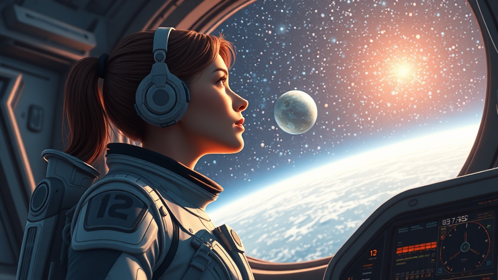 A woman in a sleek, futuristic flight suit gazes intently at the shimmering expanse of stars through the large, transparent windows of a high-tech space station, with an intricate control panel glowing softly in the background; this mesmerizing scene is beautifully rendered with a blend of CGI and artistic illustration, adding a dreamlike and slightly surreal quality to the environment, highlighting the seamless fusion of cutting-edge technology and cosmic wonder.
