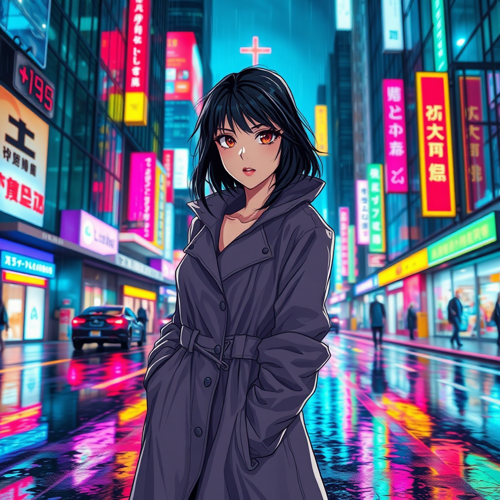 A woman in a sleek, futuristic raincoat stands confidently on a neon-lit city street, embodying anime style with detailed and symmetric features. The vibrant cityscape is drenched in cyberpunk aesthetics akin to Cyberpunk 2077, with towering holograms and rain-drenched pavement reflecting the city's glow. Her eyes shine with an intensity of full color manga visual style, framed by an anime key visual backdrop. Surrounding her is a symphony of synthesized sounds and electric hues. The scene pulsates with energy, reminiscent of the artistic flair of InkPunk768, as if art by midjourney nfixer and nartfixer has brought this universe to vivid life.