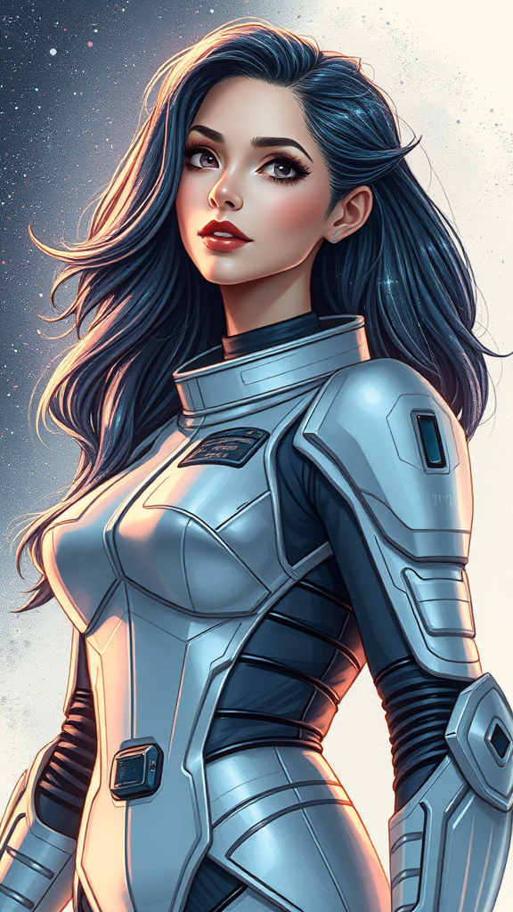 A woman in a sleek, retro-futuristic space suit stands confidently, her portrait capturing a striking blend of realism and fantasy. Her hair cascades like the Milky Way, a cosmic tapestry of stars and shimmering galaxies. The armor of her suit, intricately detailed, reflects a polished, official look reminiscent of space art from a bygone era. The artwork, hyperrealistic in nature, bursts with dynamic lighting that casts dramatic shadows across the scene. The style harmonizes 3D elements with a touch of cartoon and anime influences, while incorporating the raw charm of sketch artistry, creating a mesmerizing and fantastical depiction.