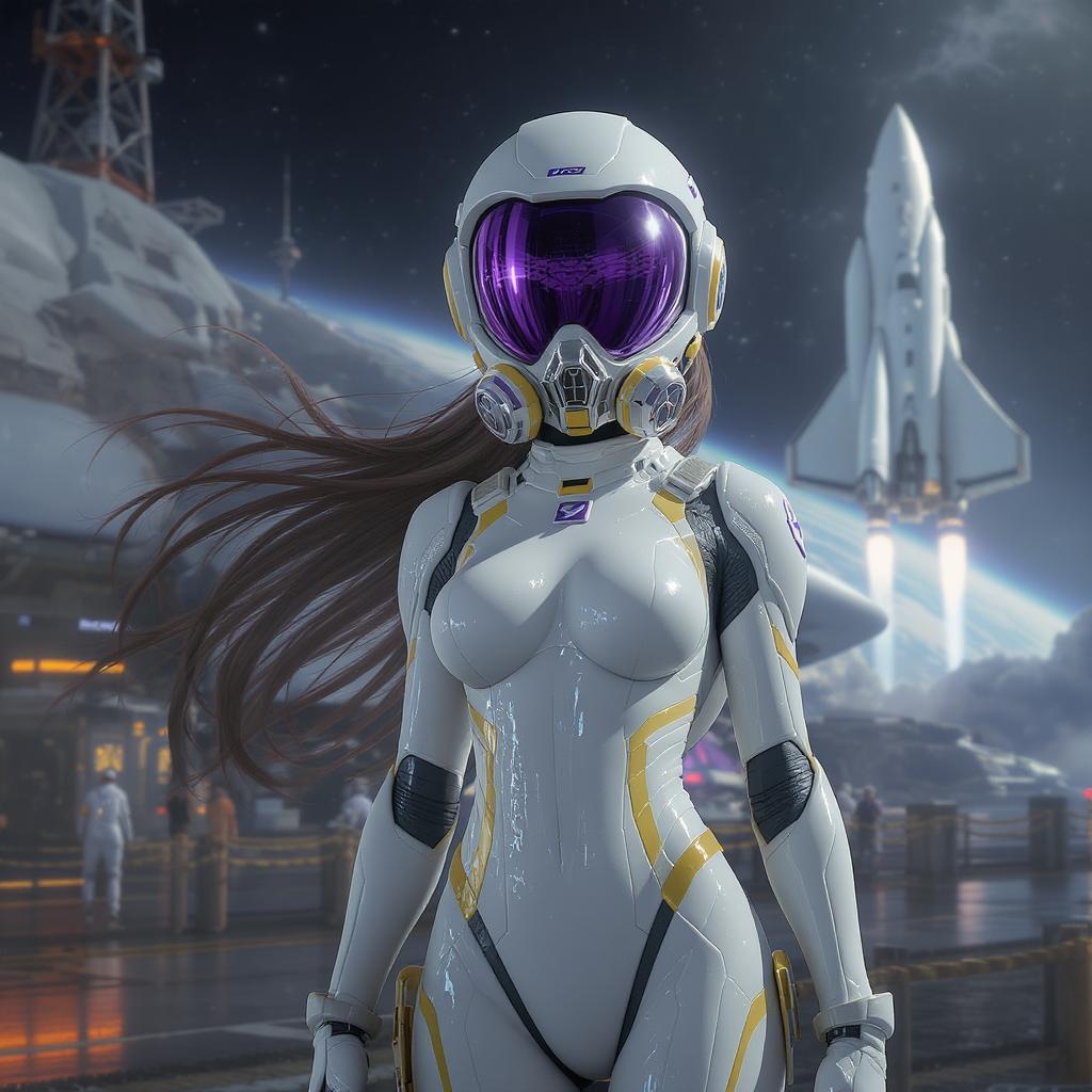 A woman in a sleek white and yellow detailed jumpsuit stands confidently at a bustling spaceport, as a spaceship ascends into the sky behind her. She wears a futuristic mask with a striking purple visor and intricately designed sci-fi lens and respirator. The scene, trending on ArtStation, is a work of art, filled with extreme details and masterful cinematic photography. The stunning environment is shiny and smooth, with a surreal and divine atmosphere evoking a celestial, anime-inspired world. The lighting is cinematic and hyperrealistic, resembling a creation in Unreal Engine 5 with lumen reflections. This 3D, doll-like render is executed flawlessly, with precise anatomy and proportions, capturing an otherworldly beauty that is vibrant and focused.