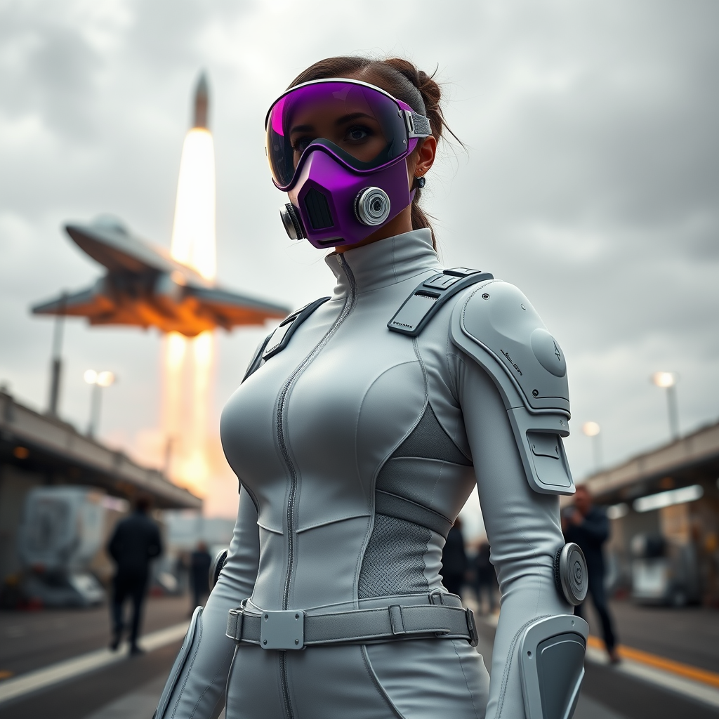 A woman in a sleek white jumpsuit stands confidently in a bustling spaceport as a spaceship lifts off in the background against an overcast sky. Her face is partially obscured by a striking purple sci-fi visor mask, complemented by a futuristic respirator. She's adorned in intricate plate armor that appears both functional and stylish, enhancing the tight-fit suit underneath. The armor is isolated in design, showcasing a blend of sharp, angular lines and smooth curves, offering a glimpse into advanced materials and technology. The scene captures her in a third-person view from below, highlighting her commanding presence. The setting is rendered in exquisite detail, reminiscent of a high-budget sci-fi movie, with lifelike textures and natural lighting adding depth and realism. Moody and cinematic lighting bathes the environment, further emphasized by the use of ray tracing for shadow and light interplay. The composition employs a photorealistic approach, creating a sense of realism that blurs the line between reality and CGI. A long exposure adds a dynamic blur effect to the surroundings, capturing the vibrant energy of the spaceport. Overall, the image is rendered in ultra-high-definition, utilizing 8K resolution for the finest details. The combination of cinematic rendering techniques, natural and moody lighting, and meticulous attention to detail creates a breathtaking visual narrative.