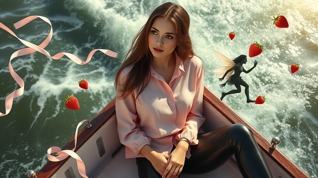 A woman in a soft pink blouse, seated gracefully on a boat amidst swirling waters. Inspired by Emma Andijewska, her expression is serene yet mysterious. She wears striking black leather pants that shimmer in the sunlight, reminiscent of Samara Weaving’s bold style. Around her, whimsical elements like delicate ribbons, playful zombies, luscious strawberries, and ethereal fairies float by. This enchanting scene has the editorial flair of a Harper's Bazaar cover, captured in an artful ratio of 3:2 with a touch of surreal elegance.