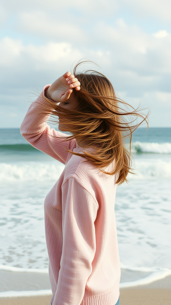 A woman in a soft pink sweater stands on a windswept beach, one hand shielding her eyes as the waves crash rhythmically against the shore. Her hair dances wildly in the breeze, creating an ethereal motion captured from afar. The scene is imbued with a nostalgic film grain texture, reminiscent of a 35mm lens, echoing the tones of Kodak Portra 400T. The ocean extends to the horizon, a vast expanse under a cloud-dappled sky. As the pink sweater blurs slightly with her movement, the photo evokes a dreamy, timeless quality, filled with quiet introspection.