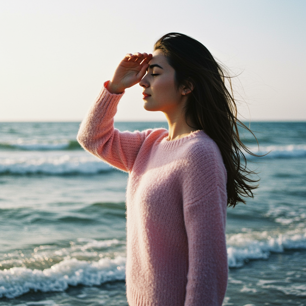 A woman in a soft pink sweater stands on a windswept beach, waves crashing rhythmically against the shore. One hand shields her eyes from the bright sunlight, and her hair dances wildly in the breeze. Captured from a distance, the scene possesses a nostalgic film grain effect, reminiscent of a classic 35mm film shot, styled in the mood of Kodak Portra 400T. The ocean's horizon stretches into the distance, with the motion blur of her pink sweater adding a dreamy dynamism to the image.