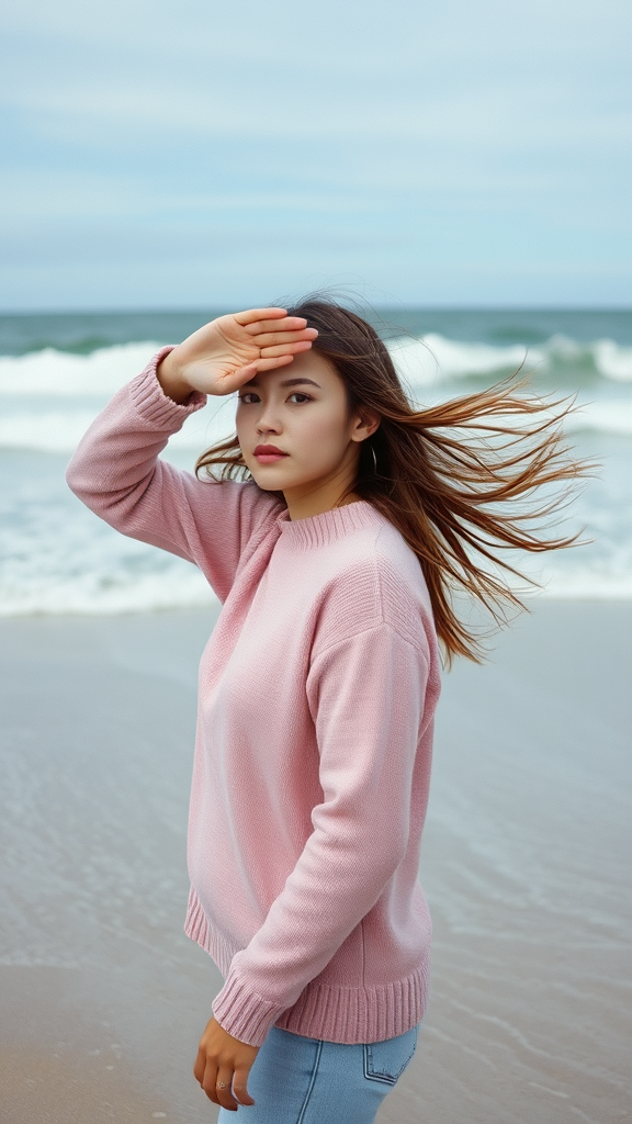 A woman in a soft pink sweater stands on the windswept beach, shielding her eyes with one hand as the waves crash dramatically against the shore. Her hair, animated by the gusts, flows behind her, creating a sense of movement and freedom. Photographed from afar with a 35mm film lens, the image captures a nostalgic film grain effect reminiscent of Kodak Portra 400T. The ocean's horizon stretches in the background, while the motion of her pink sweater blurs slightly, adding to the atmospheric depth.