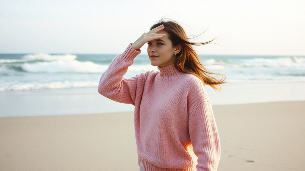 A woman in a soft rose sweater shields her eyes with one hand, standing on a sandy beach as waves crash dramatically against the shore. The wind sweeps through, causing her hair to whirl freely. Captured from afar, the scene exudes a nostalgic charm with a film grain overlay, akin to the essence of Kodak Portra 400T using a 35mm lens. The vast ocean horizon stretches endlessly, while the motion blur of the pink sweater whispers a story of movement against a static backdrop.