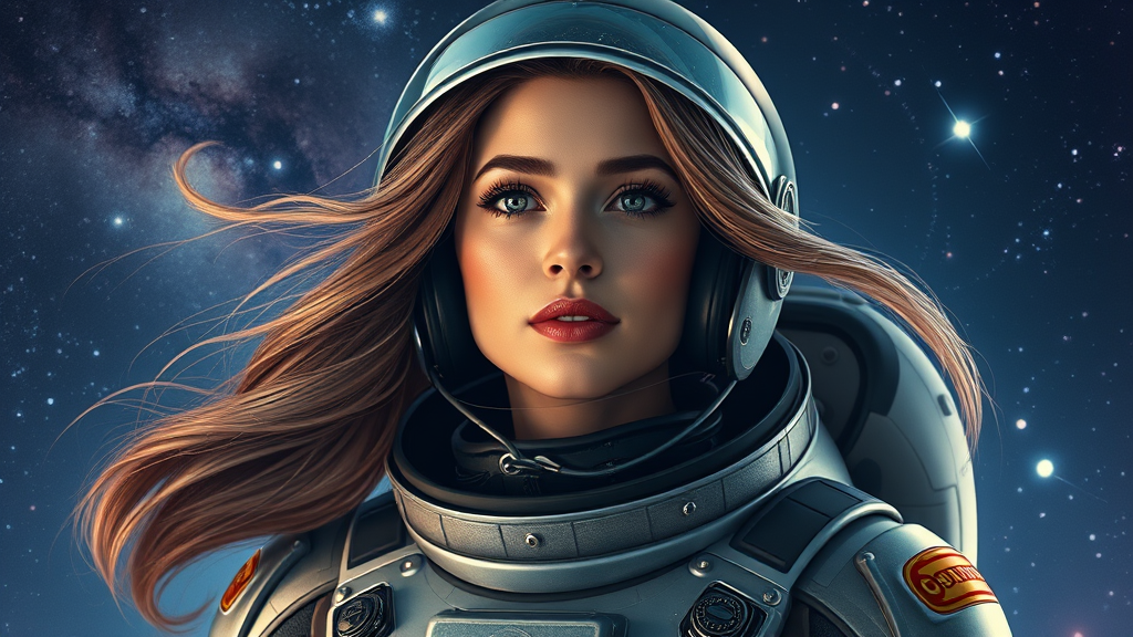 A woman in a space suit captured in a character portrait, exuding the charm of space art with retro-futuristic armor. The portrait is an official artwork of high detail, showcasing her hair flowing like the Milky Way, blended beautifully with fantastic lighting. The scene embodies hyperrealism and dynamic lighting, capturing the mysterious allure of space. Inspired by nfixer and nrealfixer techniques, the image portrays a captivating essence despite being low resolution. It embraces elements of jpeg artifacts, yet maintains its core grace and beauty. The character is intentionally depicted with a few artistic imperfections, hinting at creative mutations, out-of-frame elements, and abstract anatomy—symbolizing the unpredictable wonders of the universe. Her features might appear slightly disfigured or misshaped, adding a unique, exotic touch. Unauthorized markings like watermarks blend into the scene, adding layers to the enigmatic portrayal.