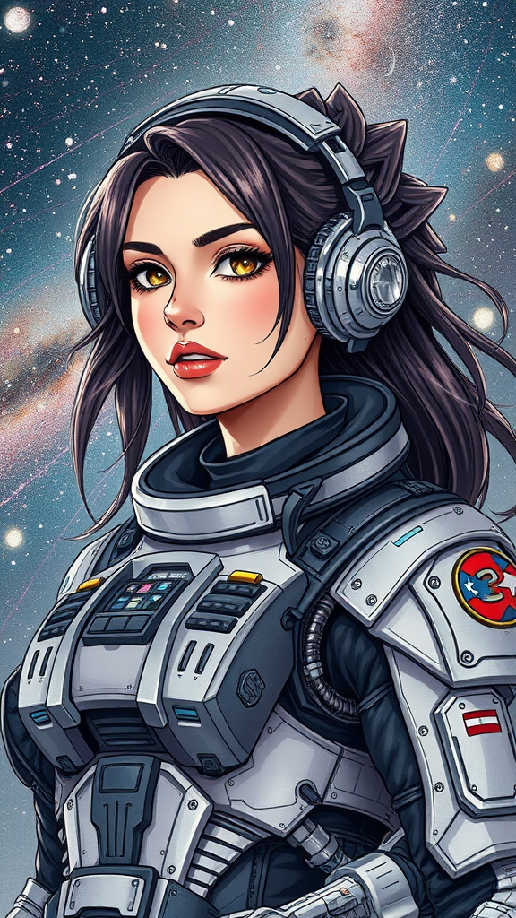 A woman in a space suit character portrait with retro-futuristic armor, detailed official artwork with her hair entwined with the glitter of the Milky Way, fantastic hyperrealism with dynamic lighting capturing the essence of space art, blending elements of 3D, cartoon, and anime styles, featuring a captivating scene with a mix of sketch-like textures.