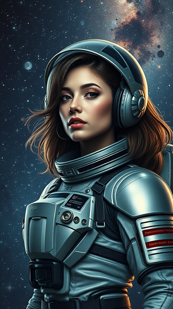 A woman in a space suit, highlighted as a striking character portrait set against the cosmos. She dons retro-futuristic armor that blends seamlessly with the universe, demonstrating high-detail through official artwork qualities. Her hair, a cascading representation of the Milky Way, adds a celestial touch, captured in fantastic screenshot art style that emphasizes hyperrealism and dynamic lighting. The setting subtly incorporates elements that suggest an otherworldly narrative, such as nfixer and nrealfixer influences. The image retains a retro flair with hints of distorted visuals like low resolution, text errors, and jpeg artifacts, while gracefully avoiding grotesque elements such as malformed anatomy, mismatched digits, and disfigurements. Unmistakable yet artfully abstract, the creation captures a sense of cosmic beauty without being bound by traditional perfection, cleverly excluding any signs of signatures, watermarks, or traditional errors.