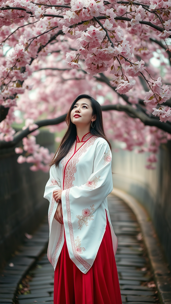 A woman in a traditional Chinese Hanfu dress stands gracefully beneath a vibrant pink cherry blossom tree, her attire featuring a white robe adorned with intricate red and gold patterns and a flowing crimson skirt. Her gently cascading waves of hair frame her tranquil expression as she gazes upward, her eyes filled with gentle wonder. The tree is in full bloom, its petals whispering down in a delicate dance. An ancient stone pathway winds behind her, imparting a sense of timeless elegance. The scene is enveloped in soft, diffused natural light, evoking a serene and contemplative mood with a pastel color palette enhanced by the subtle texture of film grain.