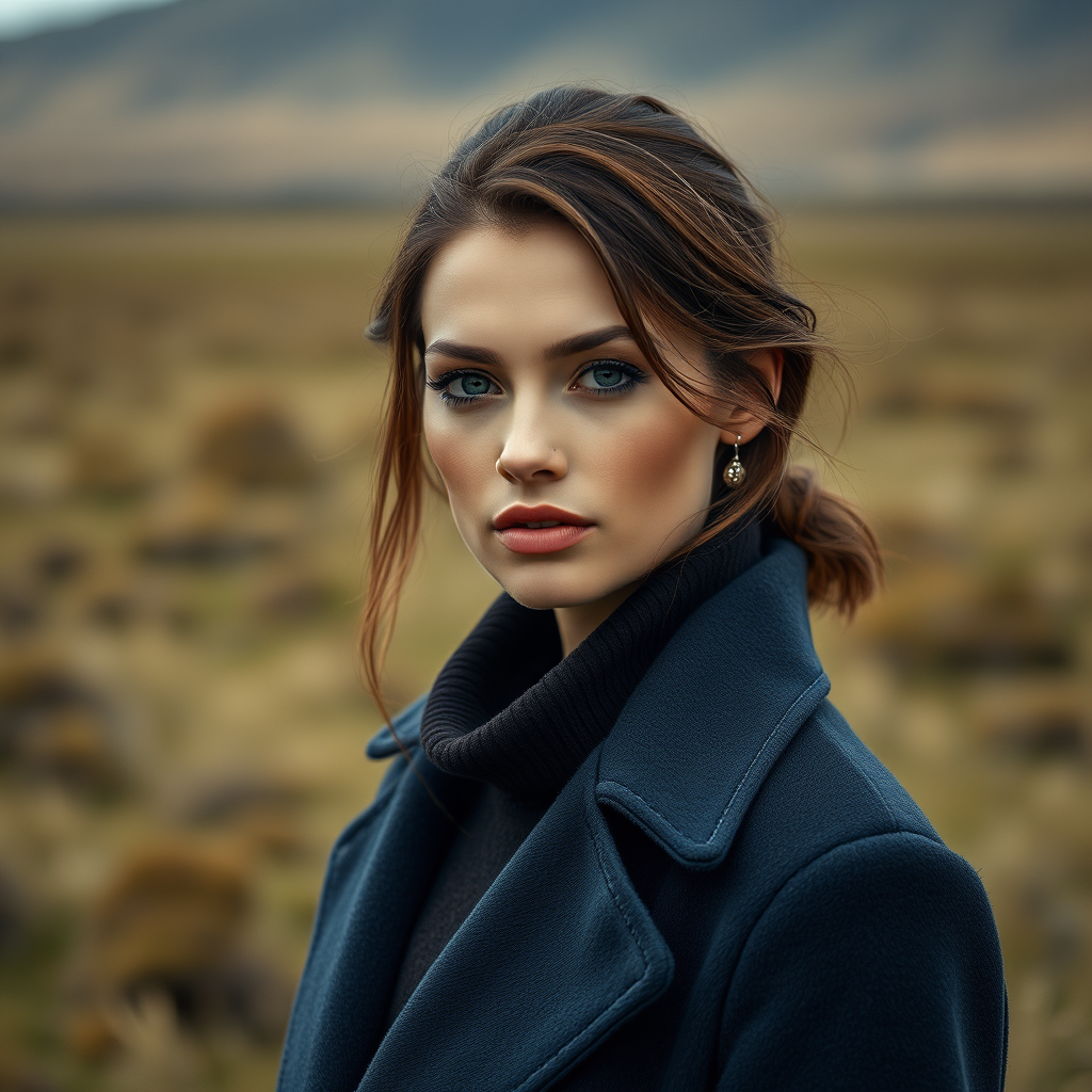 A woman in a vast Scottish landscape, captured in the style of an outdoor fashion shoot, with natural lighting highlighting her features. She is dressed in light navy and dark brown clothing, exuding elegance and sophistication. The scene is reminiscent of Georg Jensen's timeless designs, with intense close-ups that capture her essence. Shot on a Sony A7III, the composition is thoughtfully framed to emphasize the symbiotic relationship between the subject and the raw beauty of nature.