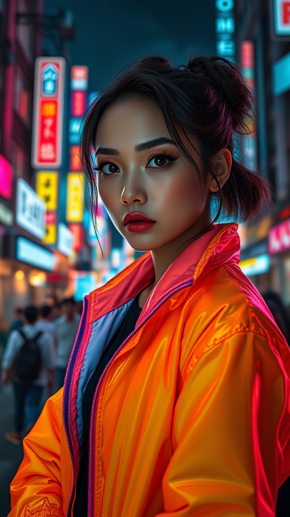 A woman in a vibrant neon jacket stands confidently on a bustling street, blending elements of gadgetpunk and charming anime aesthetics. She is surrounded by a lively cityscape, illuminated by colorful neon lights and bustling crowds. Her expressive eyes capture a sense of mystery and allure, reminiscent of the enchanting style of Ross Tran and Hikari Shimoda. The scene is rich with hyper-realistic details, from the texture of her jacket to the intricate reflections in her eyes. The composition is akin to the work of Jessica Drossin, with a cinematic depth of field and soft bokeh, as if captured by a Fujifilm X-T4 using a Sony FE 85mm f/1.4 GM lens. The atmosphere is vibrant and immersive, combining the raw energy of the city with a dreamy, otherworldly charm.