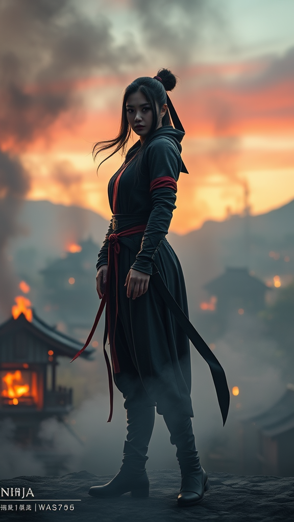 A woman in an authentic ninja outfit stands in the foreground, her striking beauty contrasted by the burning village in the background. Smoke rises through the scene, enveloped in a volumetric fog that adds a mysterious depth. She is the centerpiece of this key visual, captured in a dynamic pose that speaks to her agility and grace. The art style draws inspiration from renowned artists like Artgerm and Anna Dittmann, focusing on a high level of detail and realism. Cinematic lighting at dusk highlights the scene, creating a sense of drama and intensity. Despite being a low-resolution depiction, it's free from text errors, missing fingers, extra digits, or any disfigurements. The composition is well-framed, avoiding any signs of poor quality such as jpeg artifacts or bad anatomy. No weapons are present, allowing the viewer to focus on her and the environment without distractions.