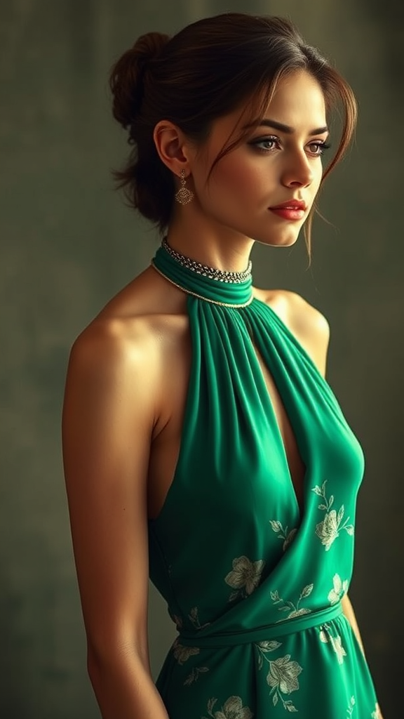 A woman in an elegant emerald dress stands poised for a photograph, reminiscent of Richard Avedon's iconic style, capturing the essence of classic glamour with a modern touch. Her halter neck, gilded with subtle metallic threads, complements the floral pattern that cascades gracefully down the soft, low-cut silk fabric. The colorized image evokes a sense of timeless beauty, echoing the artistic vibes found on Tumblr, with her serene expression and the dress flowing like liquid silk, creating a captivating visual symphony.