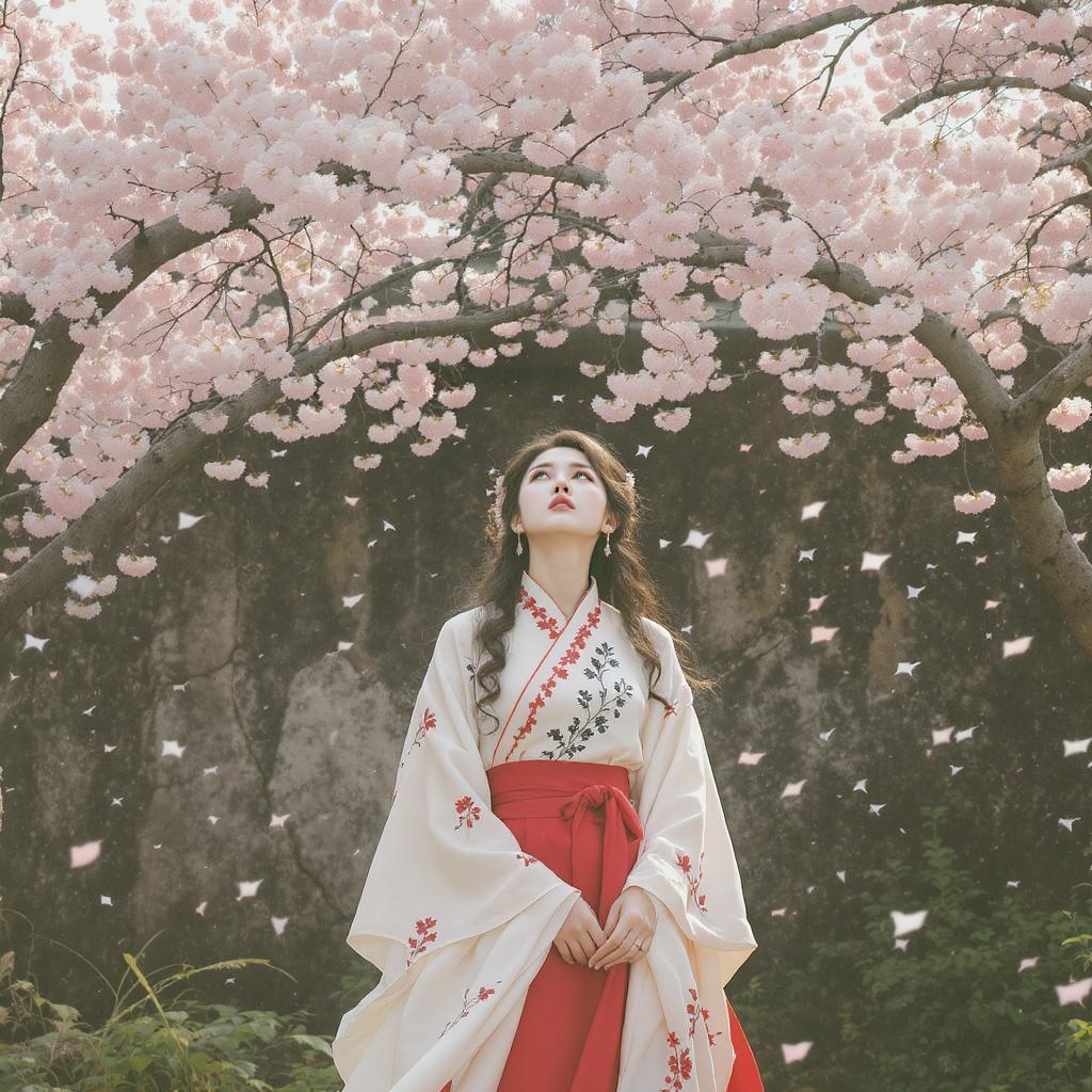 A woman in an elegant Hanfu dress, with an ivory silk tunic adorned with delicate black and crimson embroidery, and a flowy scarlet skirt, stands with quiet grace beneath a flowering sakura tree. Her cascading curls softly frame her serene expression as she gazes upward, eyes reflecting peaceful contemplation. The tree is in full blossom, with petals leisurely dancing down like gentle whispers. Behind her, an ancient stone wall provides a sense of timelessness. The scene is enveloped in soft, diffused sunlight, casting a tranquil and dreamlike ambiance with a palette of muted pastels and a hint of nostalgic film grain.