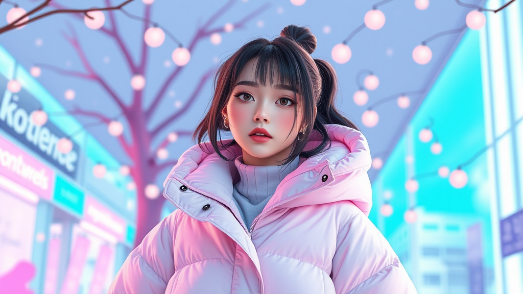 A woman in an oversized poncho-style puffer jacket reminiscent of Off-White designs, set in a whimsical digital art scene inspired by Yanjun Cheng. The style echoes the lofi girl internet meme with a touch of Tumblr aesthetic, capturing a retro anime vibe. Bright pastel colors dominate the 3D render, merging the creative flair of artists Beeple, Rhads, and Lois van Baarle. The cartoon-style illustration presents a catalog-photo quality, exuding a beautiful blend of contemporary and nostalgic elements.