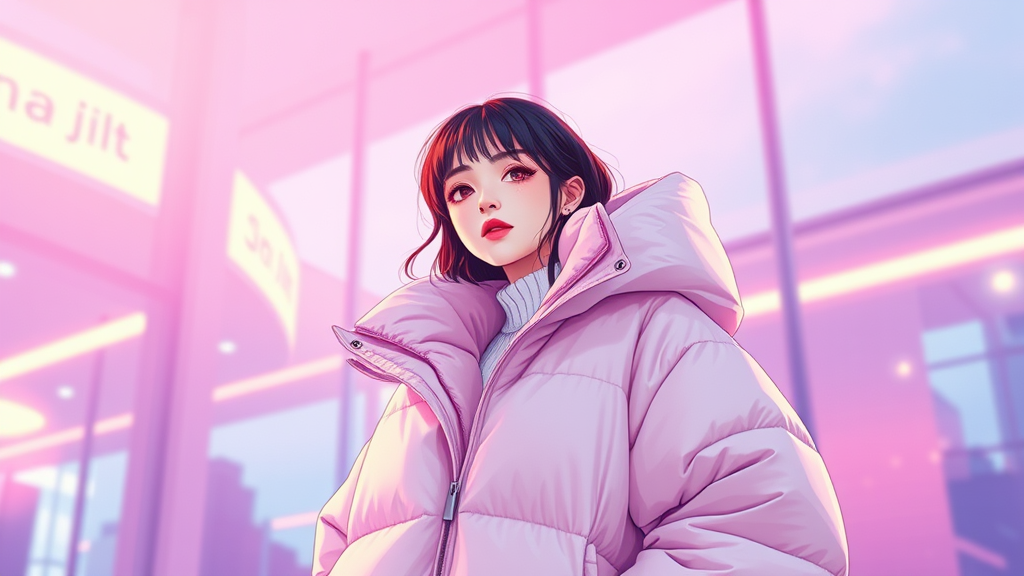 A woman in an oversized puffer jacket that mimics the style of a poncho, drawing inspiration from OffWhite and reminiscent of Yanjun Cheng's unique flair, is captured in digital art. This piece channels the lofi girl internet meme, embodying the vibe that trends on platforms like Dezeen. The scene takes on a catalog photo aesthetic, reminiscent of a 3D render in a style akin to Beeple, Rhads, and Lois van Baarle. With a cartoon-like illustration, it bursts with bright pastel colors, offering a retro anime girl feel, evoking a blend of beauty in both retro and contemporary art styles.