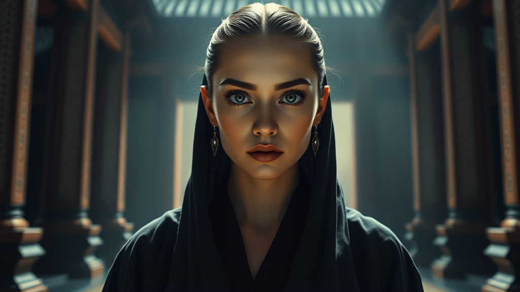 A woman in dark robes stands in a temple setting, with symmetrical eyes highlighted by dramatic lighting. The atmosphere is realistic and sharply focused, capturing a hyperrealistic scene with intricate and highly complex details. Rendered in high detail, the image embraces a physics-based raytracing approach to enrich its depth. The composition, resembling an ultra high-resolution 8K wallpaper, integrates elements of jewelry and CGI, blending 3D and digital art styles in a seamless manner. The image avoids flaws such as low resolution, artifacts, or anatomical inaccuracies, maintaining a coherent and vividly detailed portrayal at all levels.
